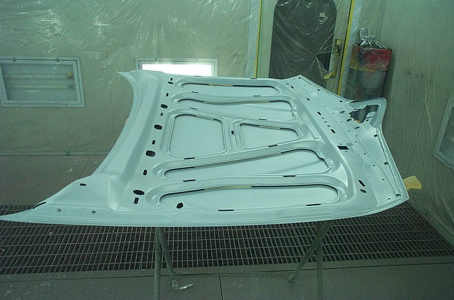 続いてボンネットの裏側にもプライマーサフェーサーを塗布します。この場合は塗膜厚は必要無いので、全体的に薄めに満遍なく塗布するようにします。裏側も、直接ベースコート&クリアーを塗布するよりも、この様にプライマーサフェーサー(又はプライマー)を最初に塗布する事により、今後の錆の発生を防げる可能性は高くなります。