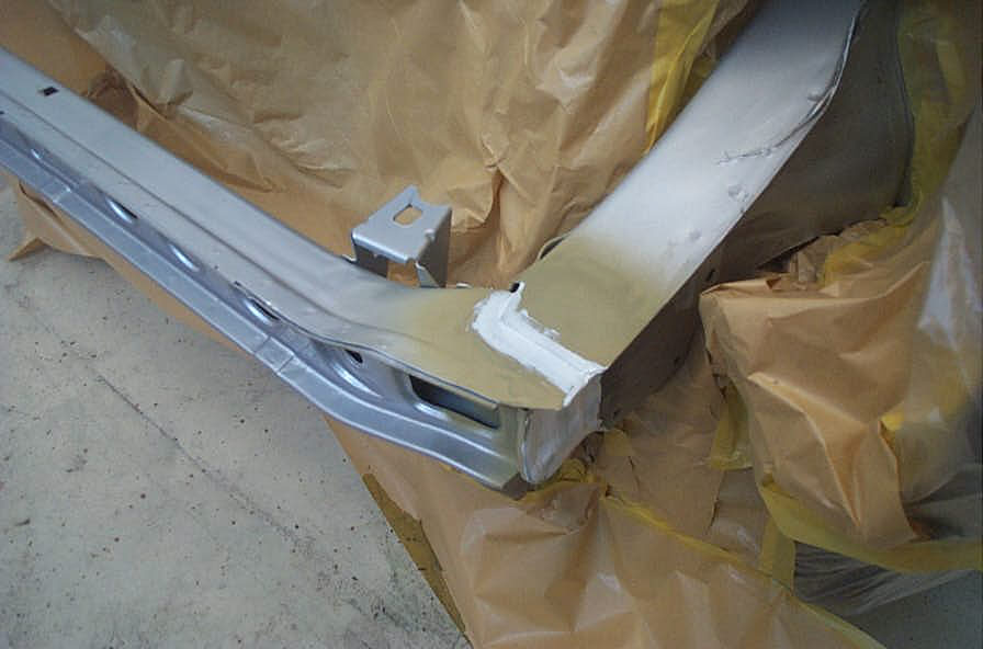 ボンネットの他に、コアサポート、クロスメンバーなども交換で、こちらも取り付ける前に塗装しておきます。所謂「裏吹き」です。これらもきっちり下地にプライマーが塗布されています。