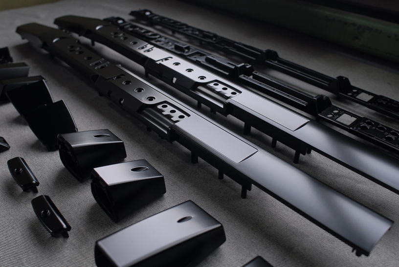 ![]() 塗装前の状態です。未塗装でプラスチック素地が露出した部品にはそれ専用のプライマー(プラスチック用プライマー)を塗布した後にトップコートを行います。どれも表面は足付け処理をして塗装が十分に密着するようにしています。 |