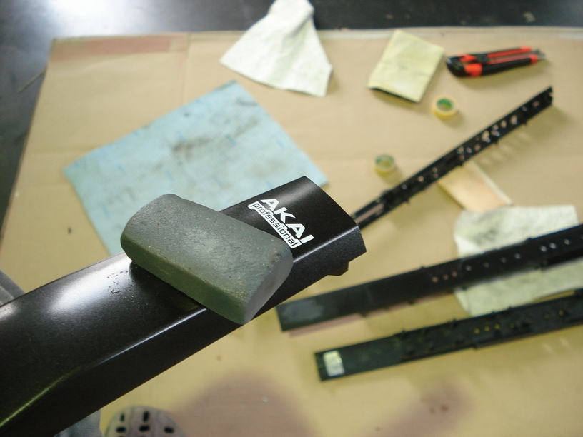 ■下地処理![]() 塗装するにあたったは既存のプリントなどの微妙な凹凸も影響されるので平らに削っておきます。 研ぎにはペーパー(研磨紙)を使うのが一般的ですが微妙なラインには砥石を使う場合もあります。 最後に全体的に#800〜#1000の番手で表面を研ぎ、塗装の密着性を高める為の下地処理を行います(足付け処理)。 |