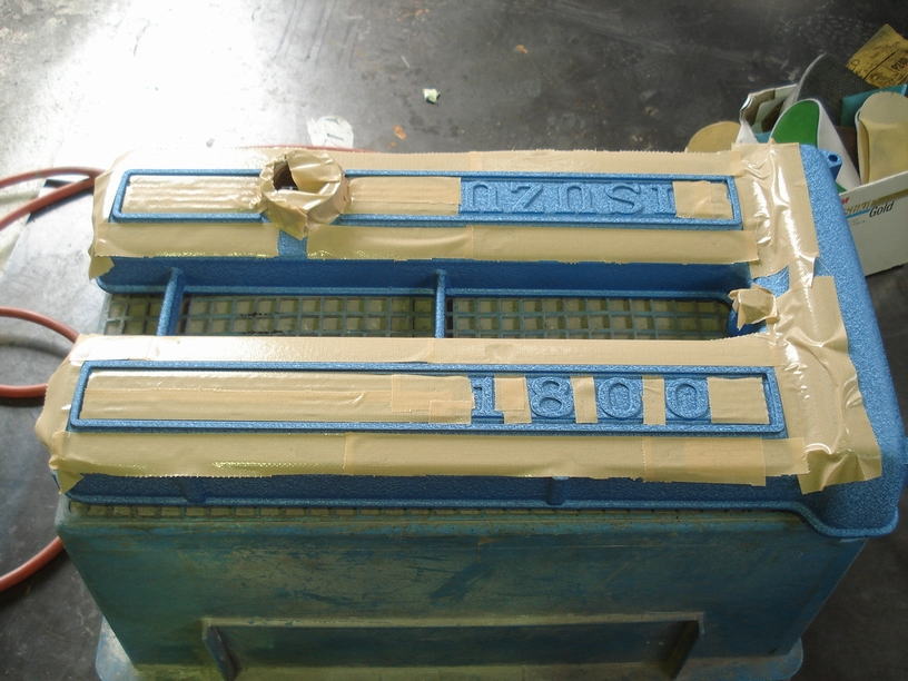 ![]() 結晶塗装を終えたら最後の仕上げとして、文字やフィンの凸部分を研磨して光らせます。その他の部分には傷が付かないようにガムテープで保護しておきます。 |