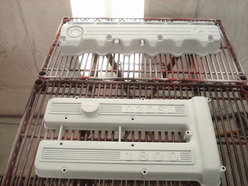 う上塗り前の金属素地には必ず下地塗料(プライマー)を塗布します。 純正部品の殆どはこれを塗っていない為に経年劣化で塗装がボロボロと剥がれてしまうのです。 |