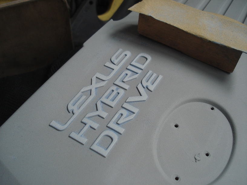 ![]() 文字の凸部分は塗ったままで仕上げますが、元々変に丸みを帯びていたので、金属的なシャープさが出るように表面を研磨してエッジを立てておきます。 |