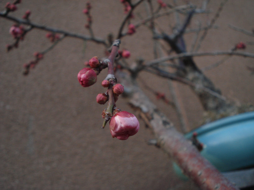 盆栽というか、こちらはホームセンターで売っている¥800程度のしだれ梅ですが、鉢をそれらしい物に変えて楽しんでおります。私の元に来て3年目の開花ですね。