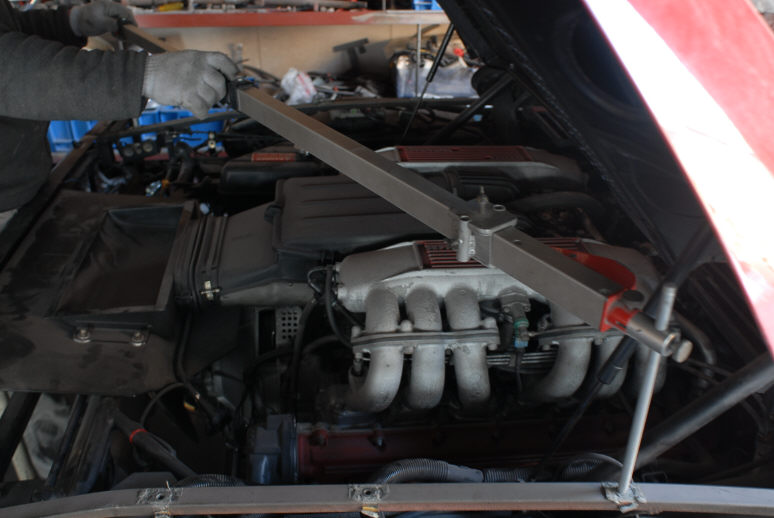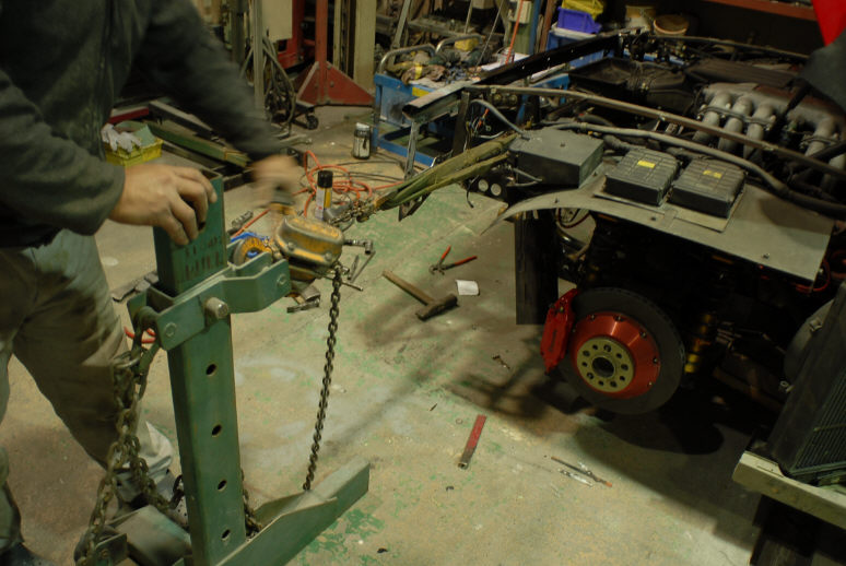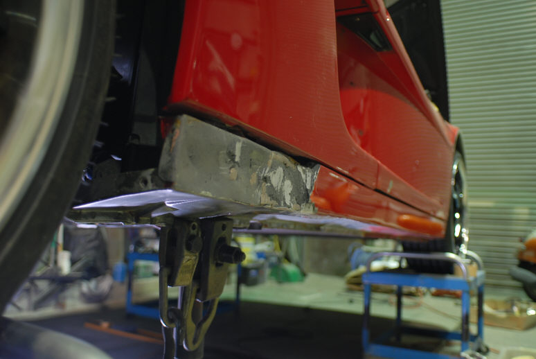 既に左右クォーターパネルとバックパネルが外されてフレーム剥き出しのフェラーリです。