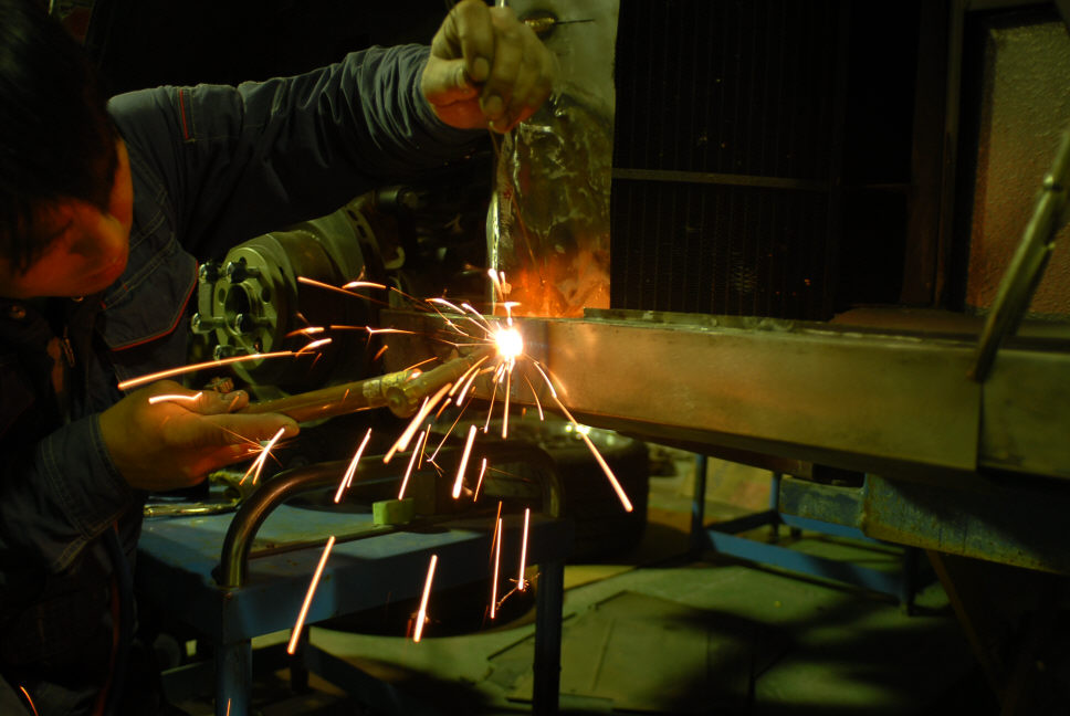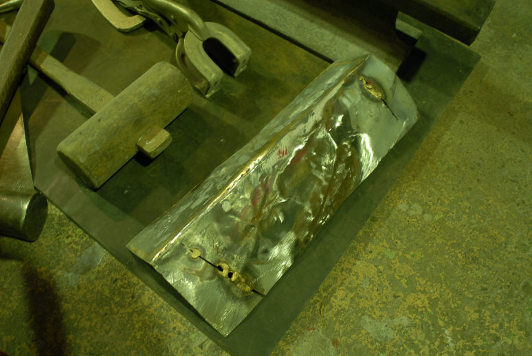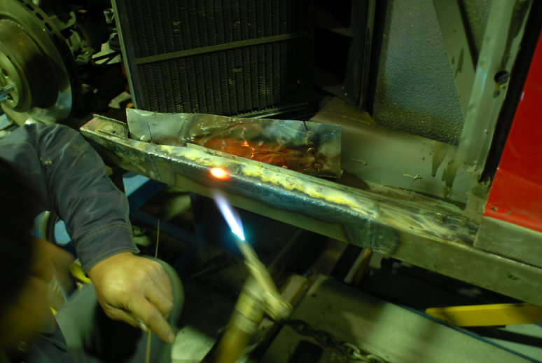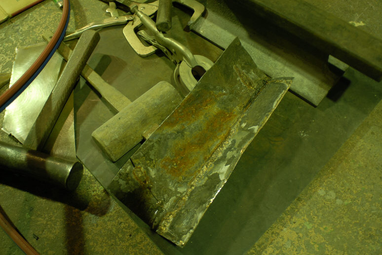 下の画像が溶接後で、こちらは切った亜鉛鋼板をまさに貼っている最初の段階ですね。左手で鉄の溶棒持って、右手の酸素(アセチレン)で母材を溶かして鉄同士を一体化させます。