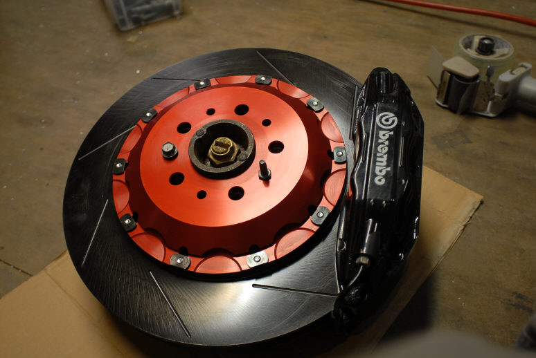 今回のローターはテスタロッサにはありえないサイズとの事でして特注との事です(恐)。 ベルの部分がアルミ?の2ピース製ですね。これもまたやる気が出る色です(笑)。