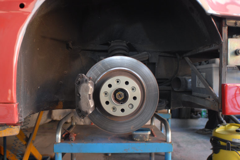 リヤブレーキ用のブラケットも出来たようでキャリパーとローターが借り組みされてました。ブレーキ屋さんから頼まれて(半ば強制的に)写真を撮影してます(爆)。
