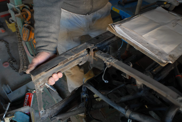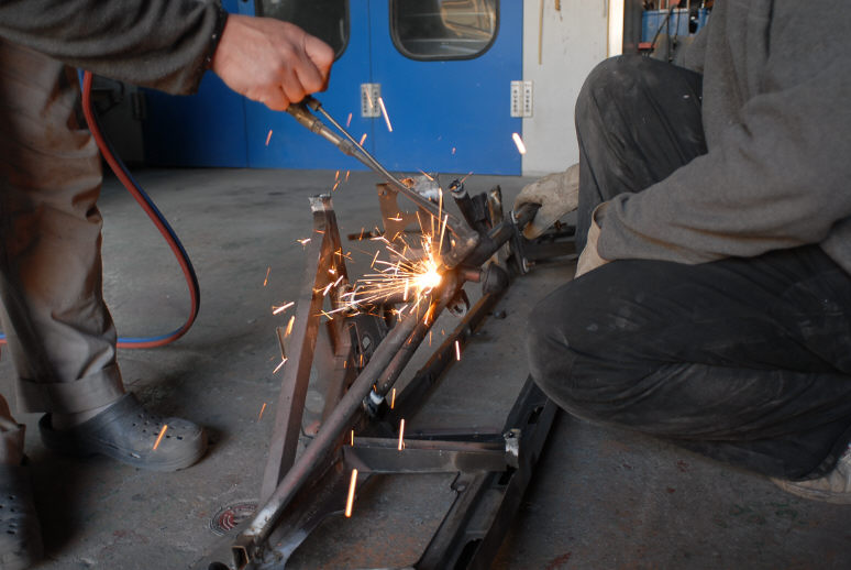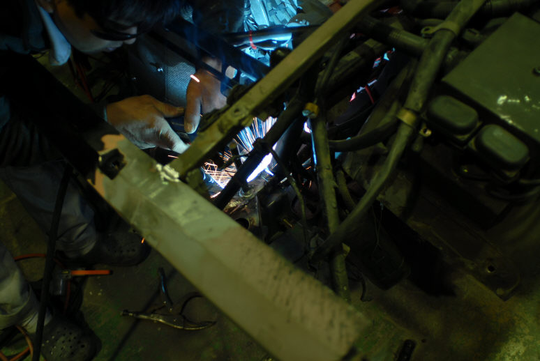 で、どこかの廃車から切り取ってきたリヤフレーム部の余計か箇所を切り取ってました。火が出ているのは「溶断」だからですね。 アセチレンと酸素の力で溶かして切ります。
