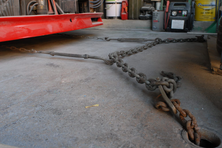 後ろ側をタワーで引っ張る際に車体が動かないように固定しているところですね。地中からチェーンが出てきます(爆)。 赤く見えるのはフロントスポイラー?です。
