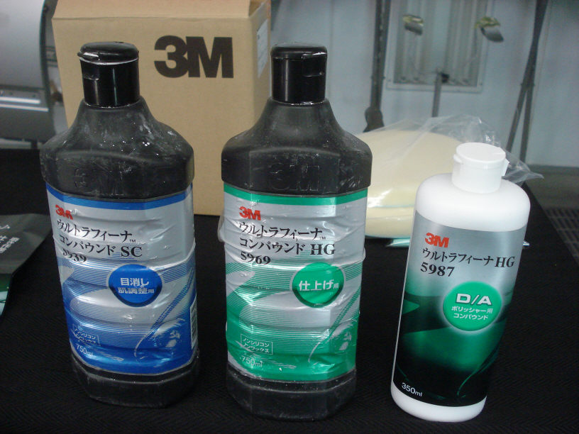 以上、全て3Mの製品です。ダンボールもそうですが、これ全てで3Mから販売されているキット物です。定価は解らないのですが、在庫処分品として数十個が在庫されております。 ボトルのパッケージがそうなんですが、元々は「ダブルアクション専用でのオーロラバフ目消し」として発売されたみたいです。しかしその後、ウルトラフィーナの「目消し肌調整用」と「仕上げ用」の2種類として販売された後者の「仕上げ用」となりました。中身は全く一緒との事です…!(3Mに直接確認して貰いました)。