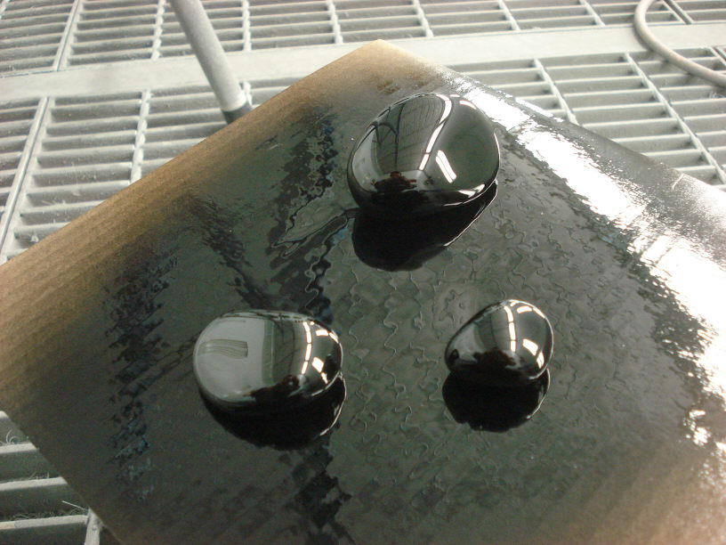 こちらも結構前からある技術で、水圧転写です。木目調のフィルムを水面に浮かべて、水圧を利用して水面に浮いたフィルム(と言っても顔料分がメインですね)を被塗物(石ですね)に貼り付けます。その後よく乾燥させてクリアーを塗ります。