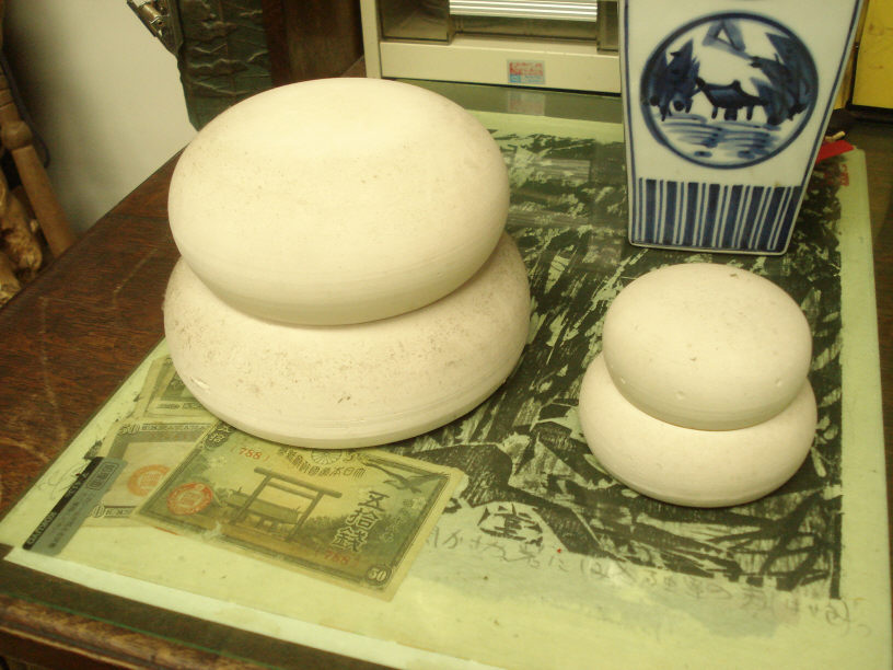 で、肝心の画像ですが,お正月用の鏡餅が3つと1つ(?)です。奥のまともな鏡餅3つはゴトー家で飾られる物だと思います(多分…)。 で、一番手前の意味不明な物体は、おととしに作成していた「なんちゃって鏡餅」です。作成途中で作業が止まってしまい現在に至ります。まだ仕事が残っているので年内に仕上がるのは難しく、また来年に持ち越しですね…。 素材は発砲ウレタンボードをメインにし、大体のフォルムを作成した後にポリパテを塗布してあります。 タックに引っ越して来た時に、志半ばで止まったコレも一緒に持ってきてあげたのですが、ゴトー氏に見せた時には結構ウケてました。仕上げはテカテカでシルキーなホワイトパールに塗りたいと思っております。