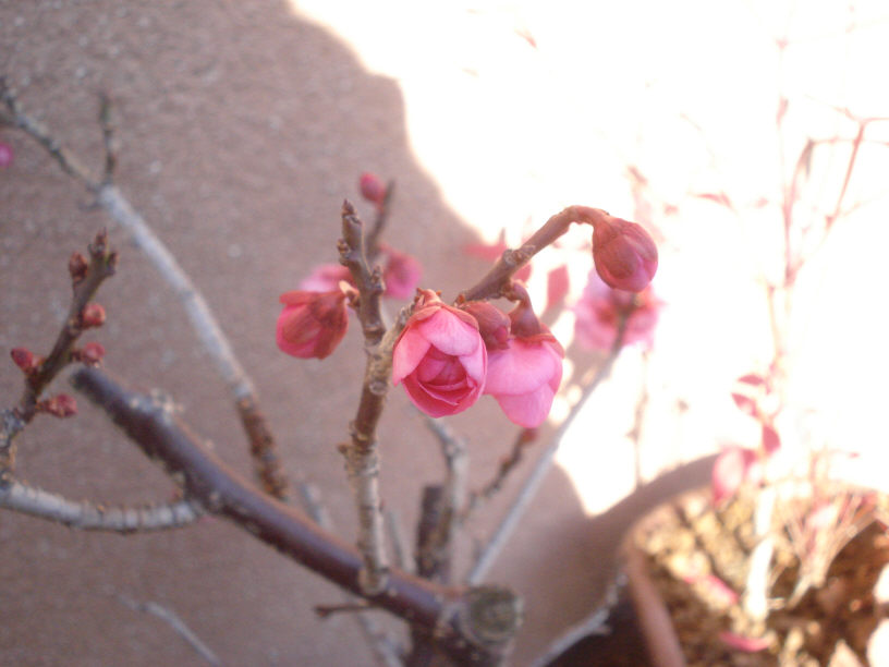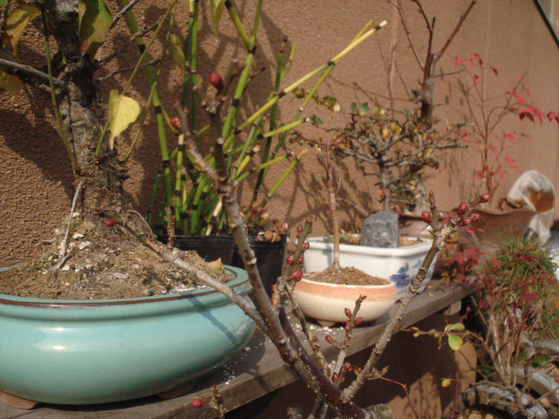 画像は素人盆栽で、TACの皆さんの好意により(というか勝手に)工場の裏に置かせて貰っています。引越しの際に一緒に連れて来ました。今年はかなりサボってしまったので、枯れては生えての繰り返しで徒長枝もひどい有様ではありますが、梅の花芽は無事付いてくれました。少しではありますが…。今から春が楽しみです。