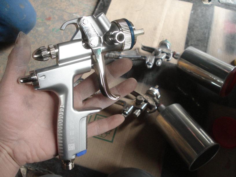 私は今はIWATAの低圧ガンがメインですね。ベースは完全低圧で、クリアーは低圧ベースのガンでノズルを変更した物です。極力「ネタ」を撒き散らさないようにした結果ですね(経済的にも環境的にも)。