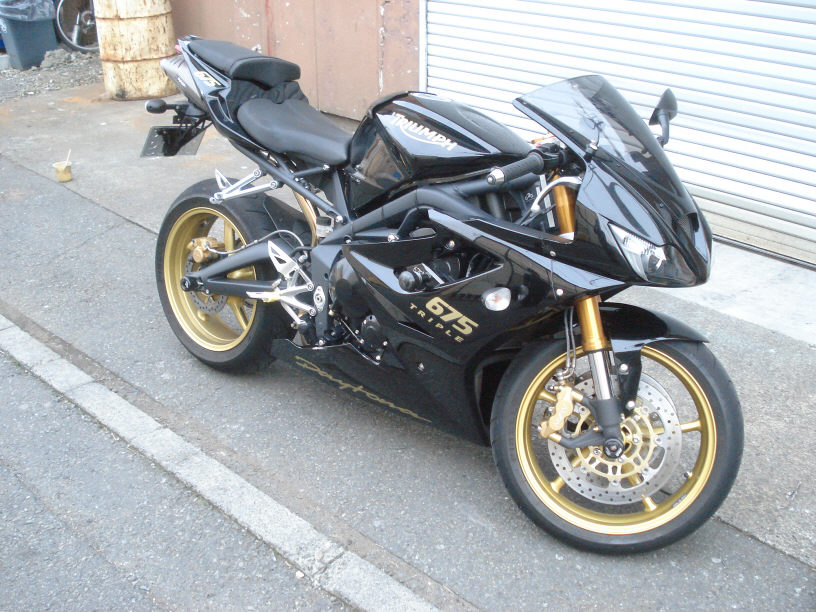 今回新しい車体に買い替えて、先日サーキットで前転(?!)してしまい各部に損傷を負ったとの事です。バイクが前転って、乗った事が無い方だと想像が付かないと思いますが、乗ってる私も想像がつきません…(爆)。なんでも、車体のバランスが前転し易いのか、元々体重が重い方向けらしいです(ちょっと間違えているかも知れません…)。英国製のトライアンフです(←何ゆえここで車体の説明なのでしょうか…)。