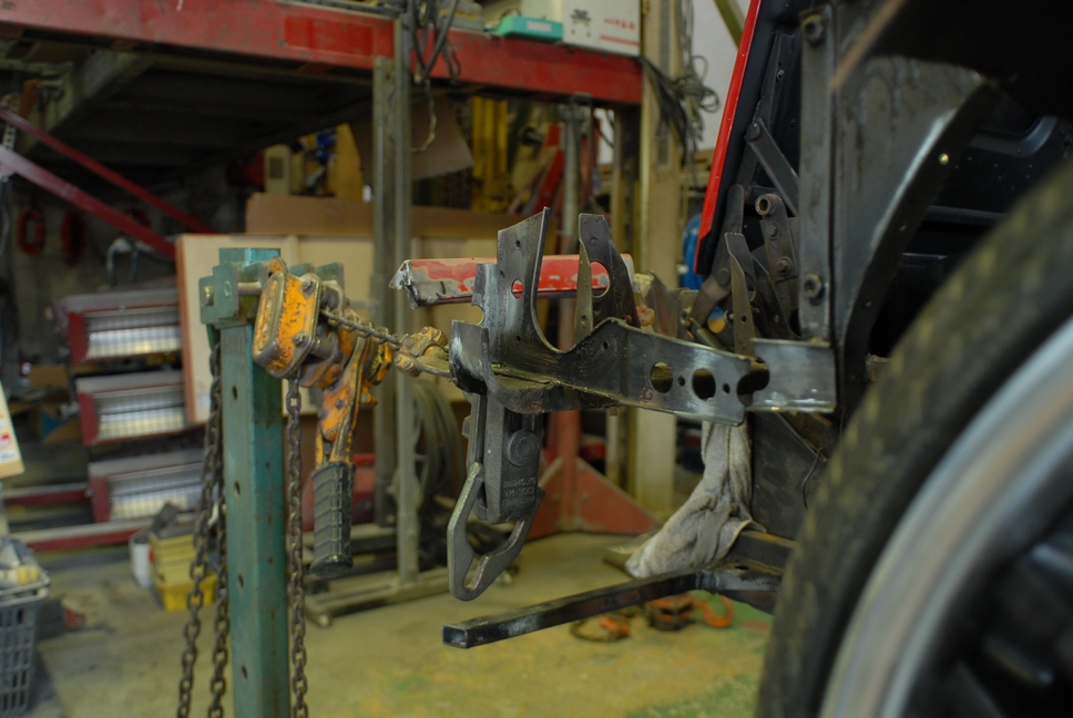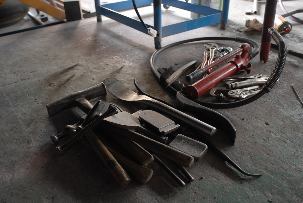 画像の手前が「ハンマリング」の為の板金工具で、奥にある赤い筒は「ポートパワー」ですかね。油圧の力でシリンダーが伸びます。確か某窃盗団が宝石店の壁を外側からぶち破った時に使った工具です(笑)。
