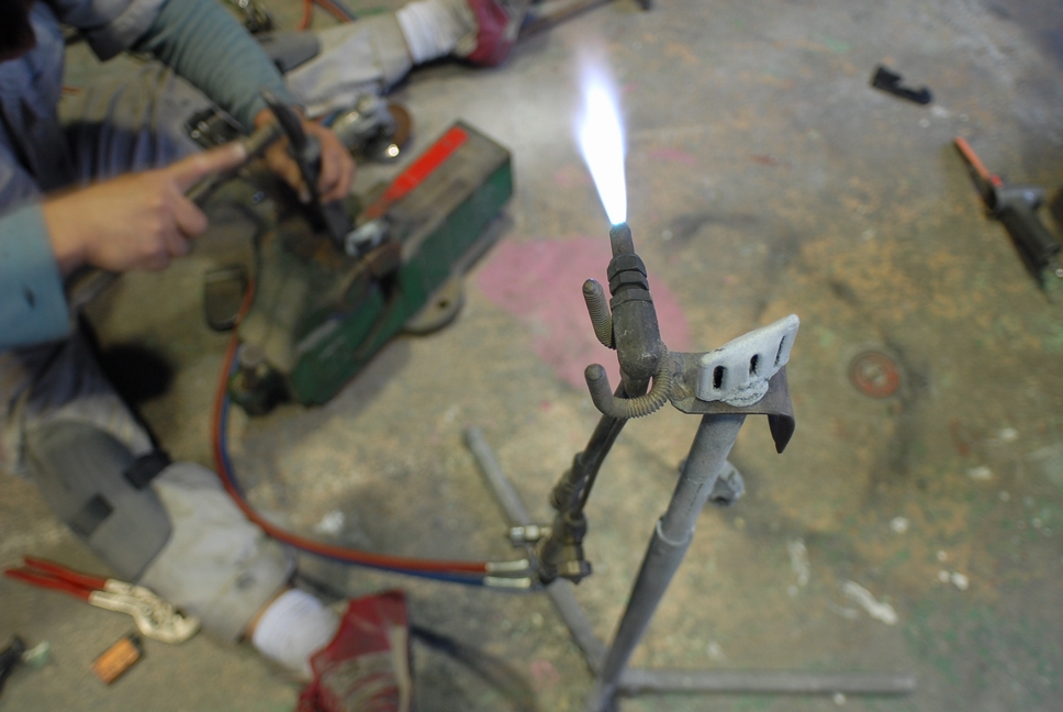 そこを這っている赤いと青のゴム管は「アセチレン」と「酸素」で、習った筈なのですがどっちがどっちだかは忘れました…(危)。