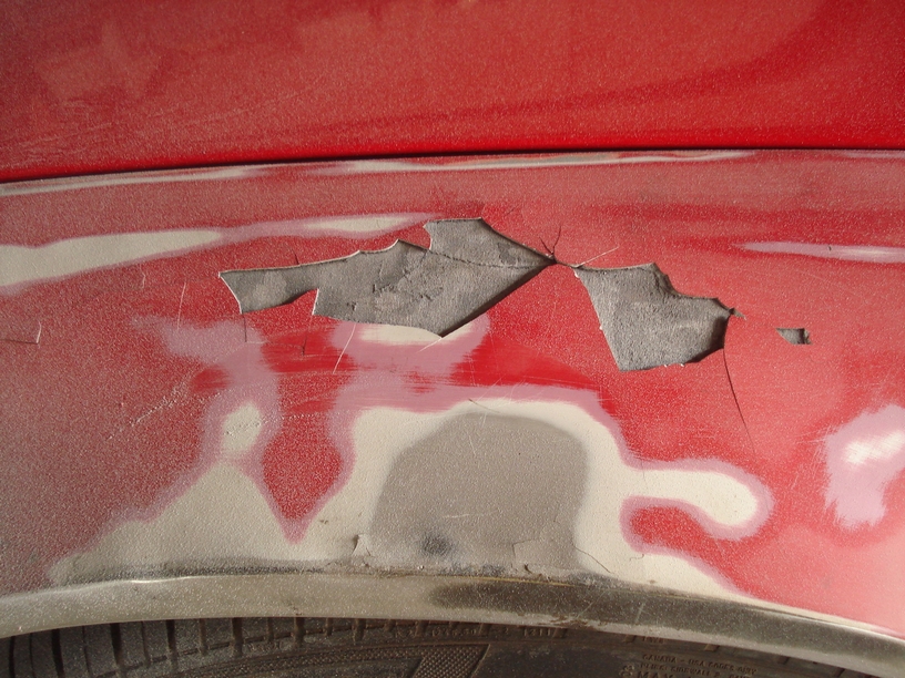 どうやらフロントフェンダーは以前の事故でへし曲がったままパテを付けられていたようで、フェンダーを元に戻すと付いていたパテが割れてしまったようです。まあ今更驚く事は無いですね(笑)。