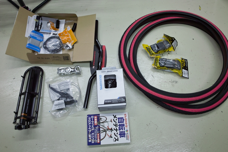 画像手前にあるアルミ製の物はハンドルを固定する為の「ステム」なるパーツで、今回購入したのは角度が変えられるタイプです。 結構良く出来ていて格好良いと思いきや、こんな部品でも¥2,000程度で買えたりします。良いんですかね…(安過ぎて心配になりなす)。