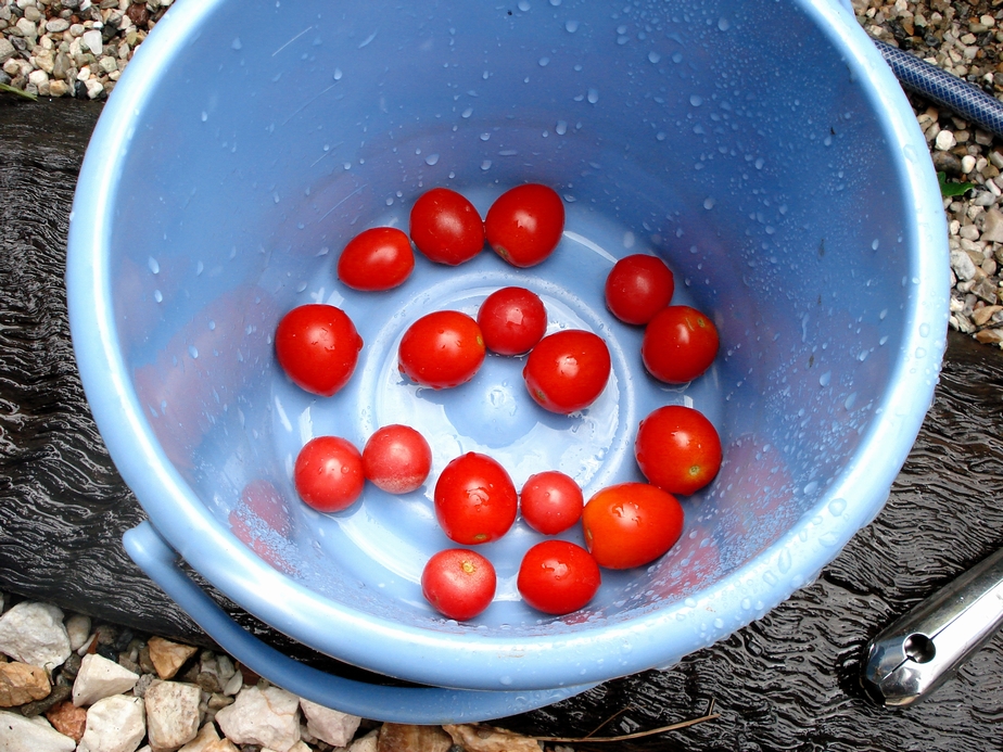 画像はその収穫したプチトマトで、これと同じくらいの量は採るのが遅れて殆ど破裂寸前でしたからもうおなか一杯です(捨てるのもなんですのでその場で食べてしまっています)。