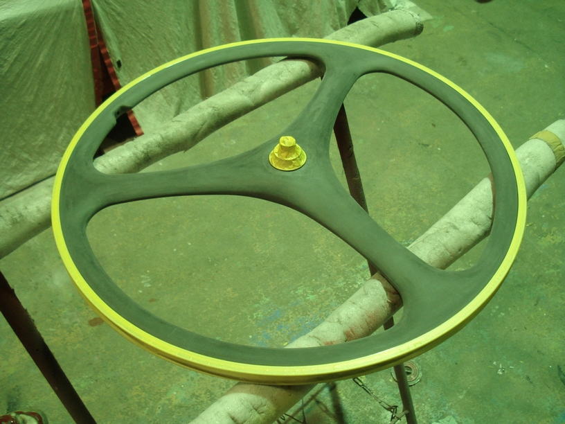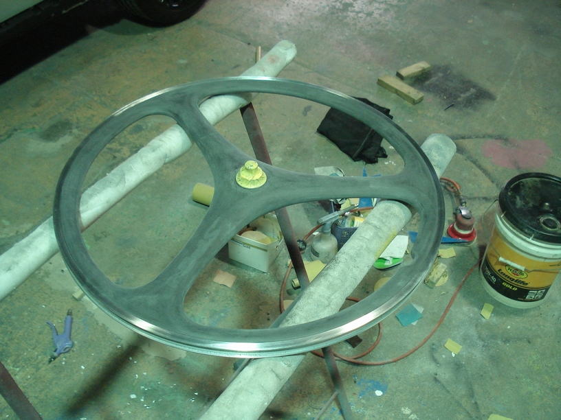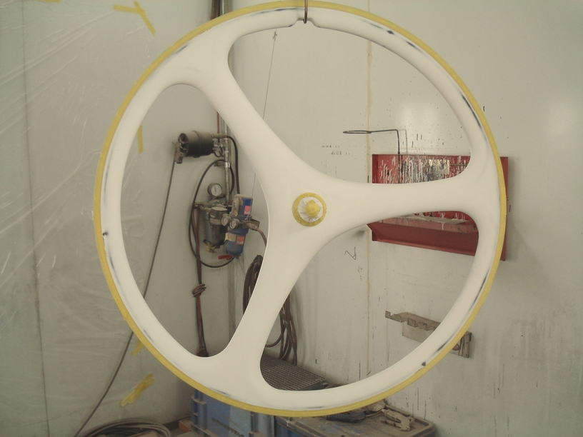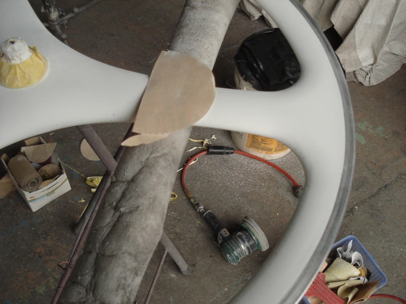 ■下地処理![]() サフェーサーが完全硬化したら表面を平滑に研磨します。特にリム部分と塗装面がフラットになるようにギリギリまで塗膜を薄くしておきます。 |