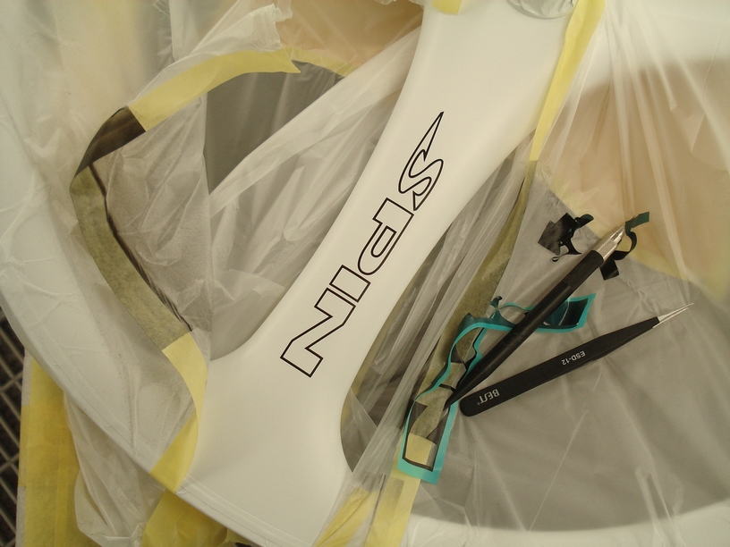 ■本塗り(ロゴ入れ塗装)![]() ベースカラーのホワイトを塗り終え、十分にテープフリーな状態になったらロゴ入れの塗装を行います。 作業効率を考えたら先にロゴの部分を塗装しておいた方が楽なのですが、白よりも黒の方が隠ぺい力が強いという特徴から膜厚を薄く仕上げられる為、先に白を塗ってから黒を塗るのが基本となります。 |
