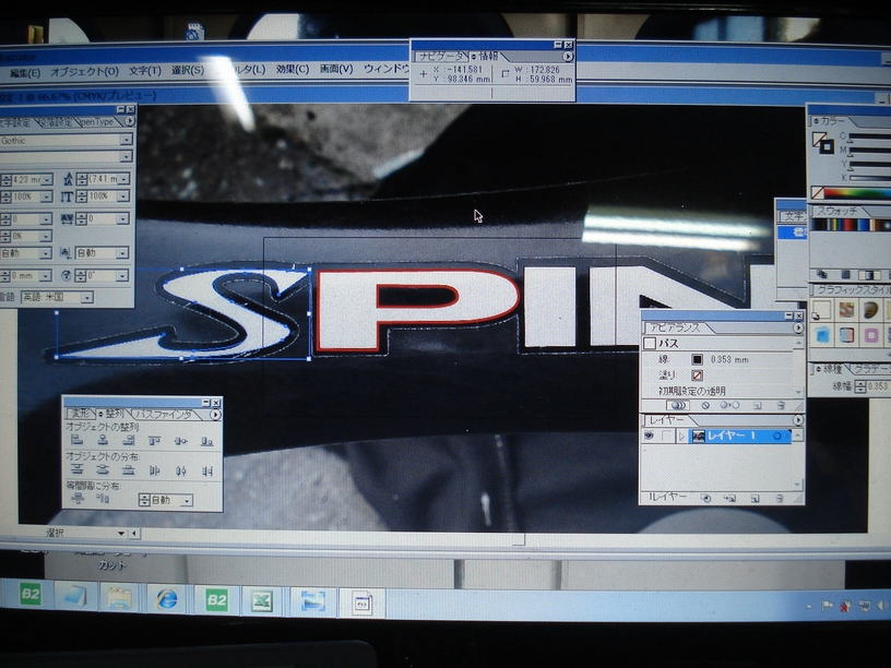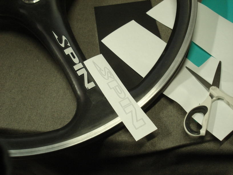 ■ロゴデータ確認![]() マスキングシートを作る前に紙に印刷をして実物のホイールに当てて確認します。 ロゴはべた塗りではなくフチのみを黒にしてスッキリとしたデザインにします。 |